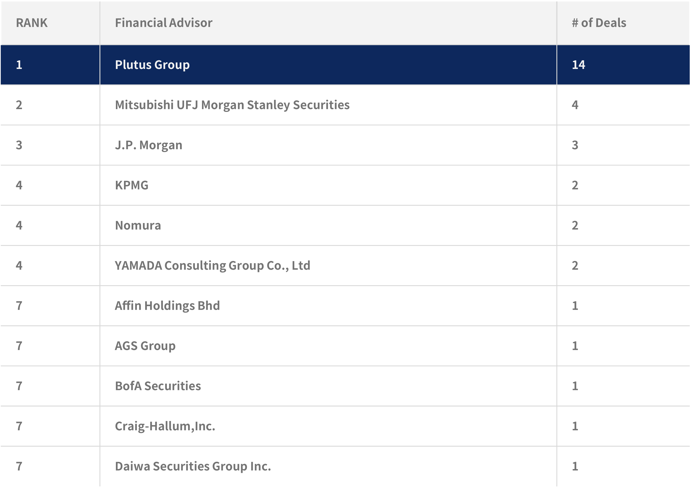 Japan Fairness Opinion Financial Advisor Rankings Full Year 2024