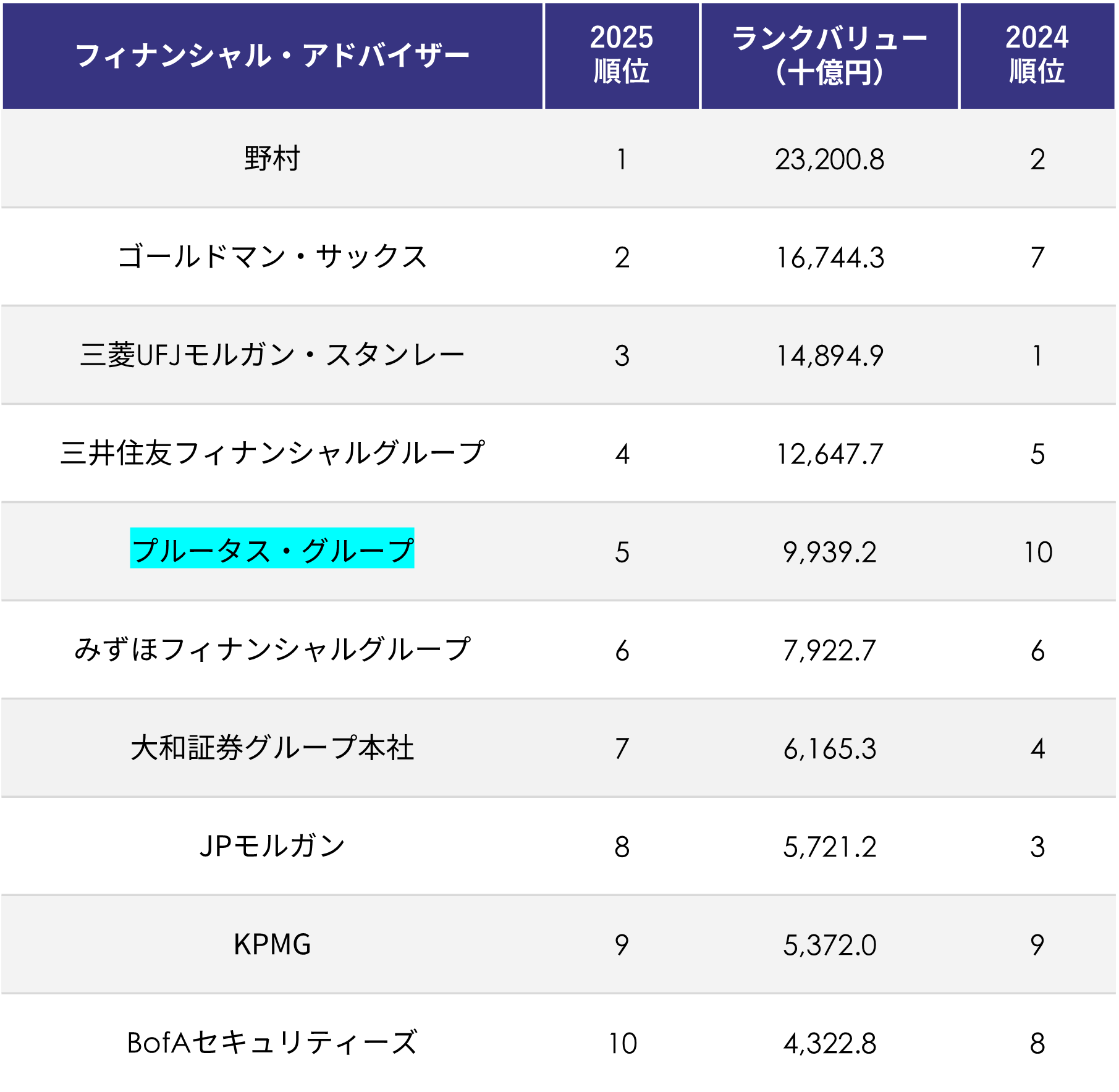LSEG(旧リフィニティブ)から日本M&Aレビュー(2025年通年)フィナンシャル・アドバイザーランキングが発表され、日本企業関連 公表案件 ランクバリューベースにおいて、5位を獲得しました。