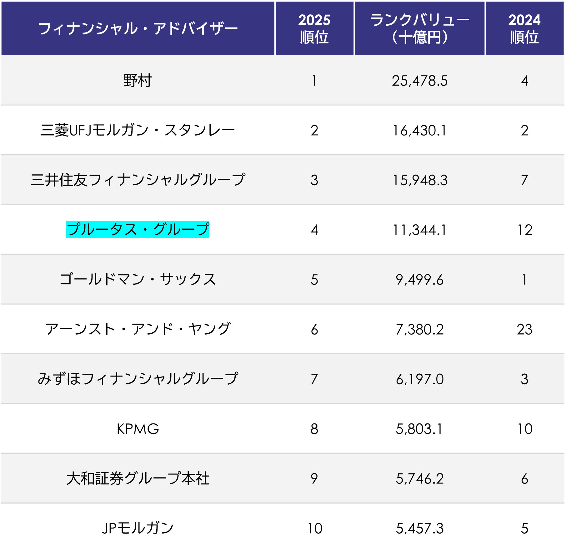 LSEG(旧リフィニティブ)から日本会計年度インベストメント・バンキング・レビュー(2025年度)フィナンシャル・アドバイザーランキングが発表され、日本企業関連 公表案件 ランクバリューベースにおいて、4位を獲得しました。