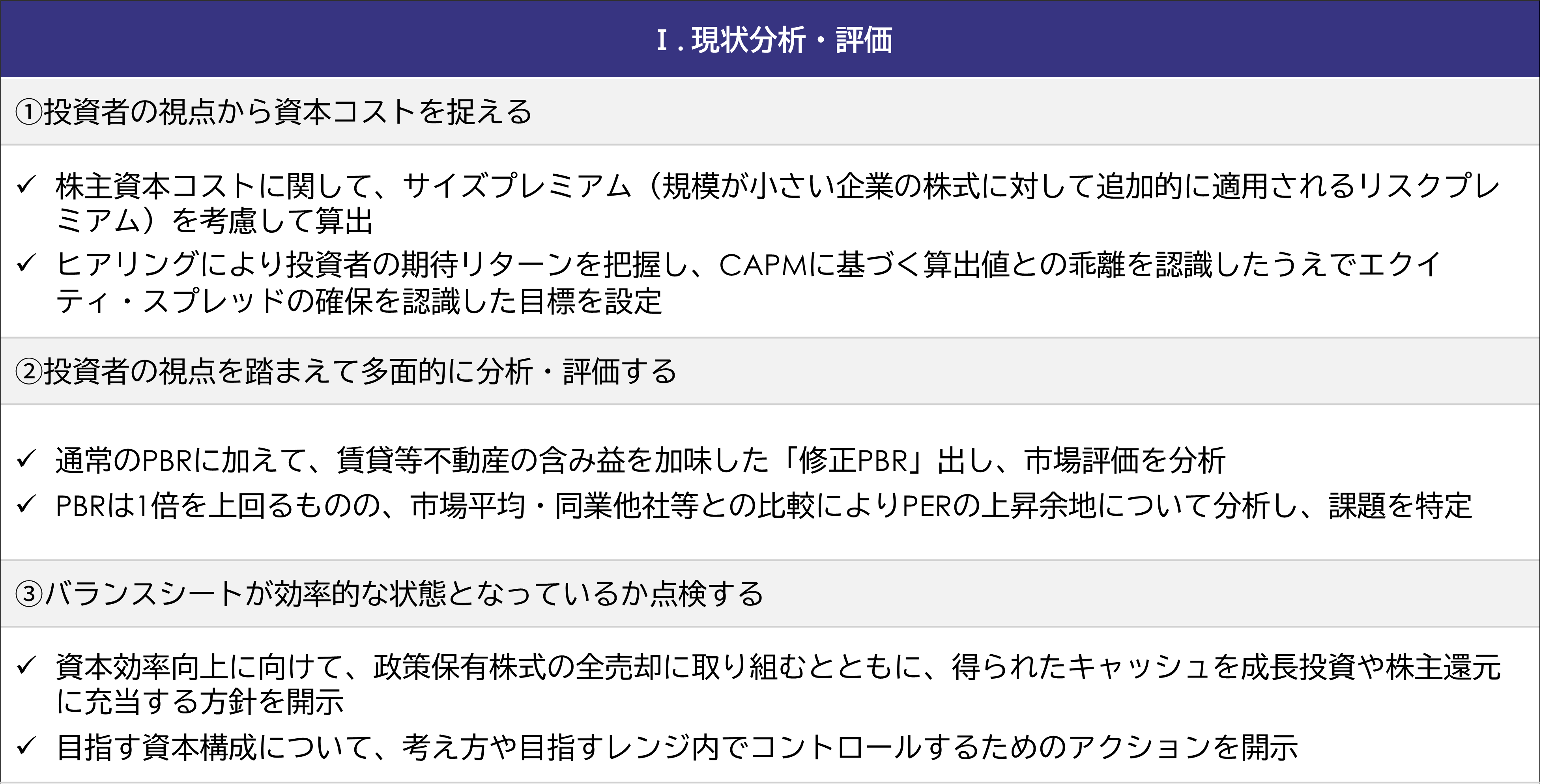 CAPMによる株主資本コストでの算出のみならず、市場評価(現在価値)に基づく株主資本コストも算出も行っており、かつ各種パラメータの開示や当社固有のβ値に係る詳細な説明も記載されております。これらの取組みは、エクイティスプレッド(ROE – 株主資本コスト)を分析する上で投資者から一定の信頼度が得られるものと思われます。東証からもパラメータの開示や複数の算出モデルを用意いて分析する事が推奨されており、当社の開示は「Ⅰ現状分析・評価」における投資者の視点から資本コストを捉えた好開示例といえると思われます。