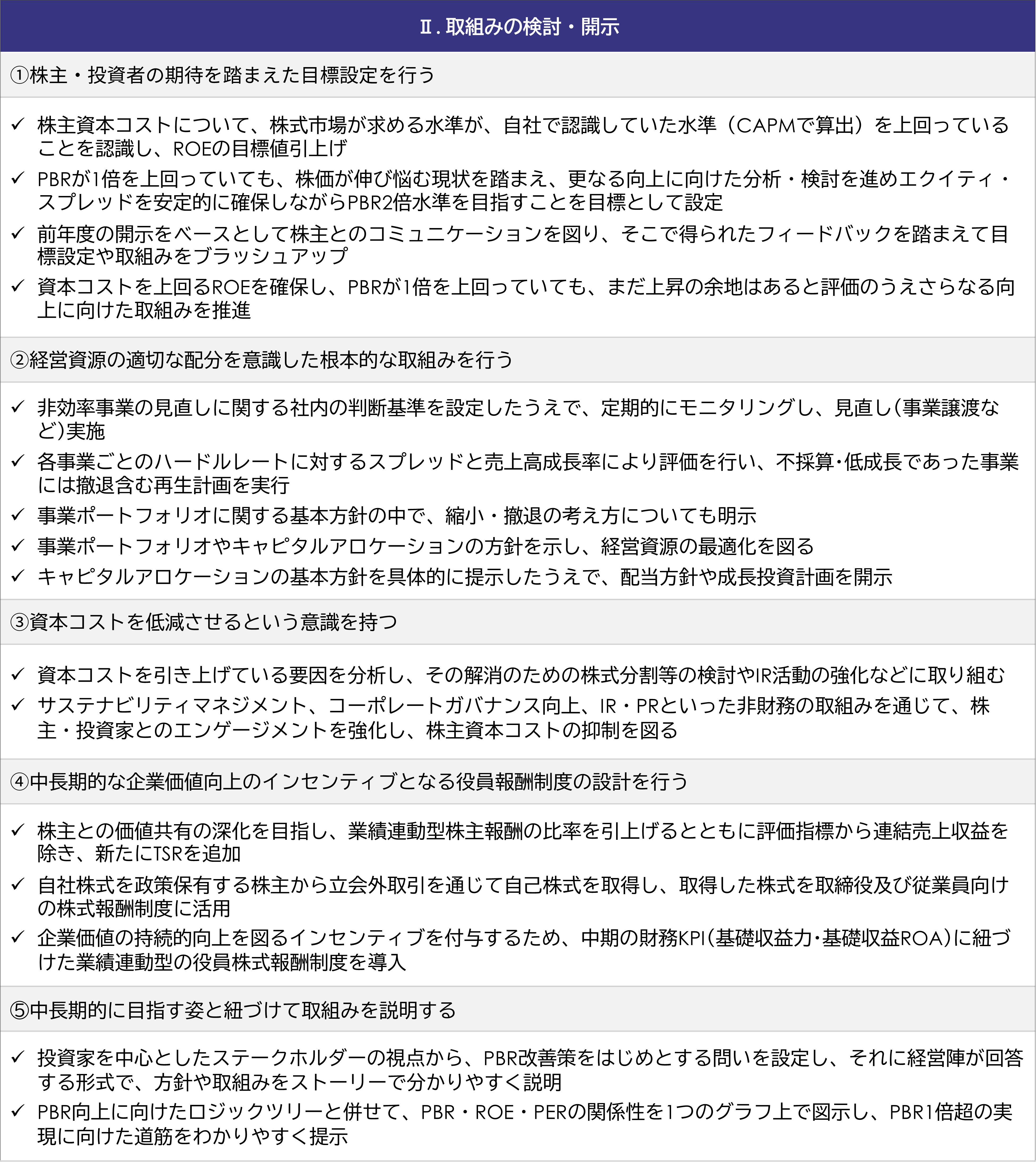 「現状分析・評価」⇒「取組みの検討・開示」⇒「株主・投資者との対話」の3つの事項について議論を深めていく事が重要なプロセスとなり、その上で取締役会にて具体的な取組みについて意思決定を行い、その内容及び取組み状況についてCG報告書の新設入力欄に「取組みの概要」「主な目標設定」などのサマリー文章の記載する事が望ましい姿であると思われます。