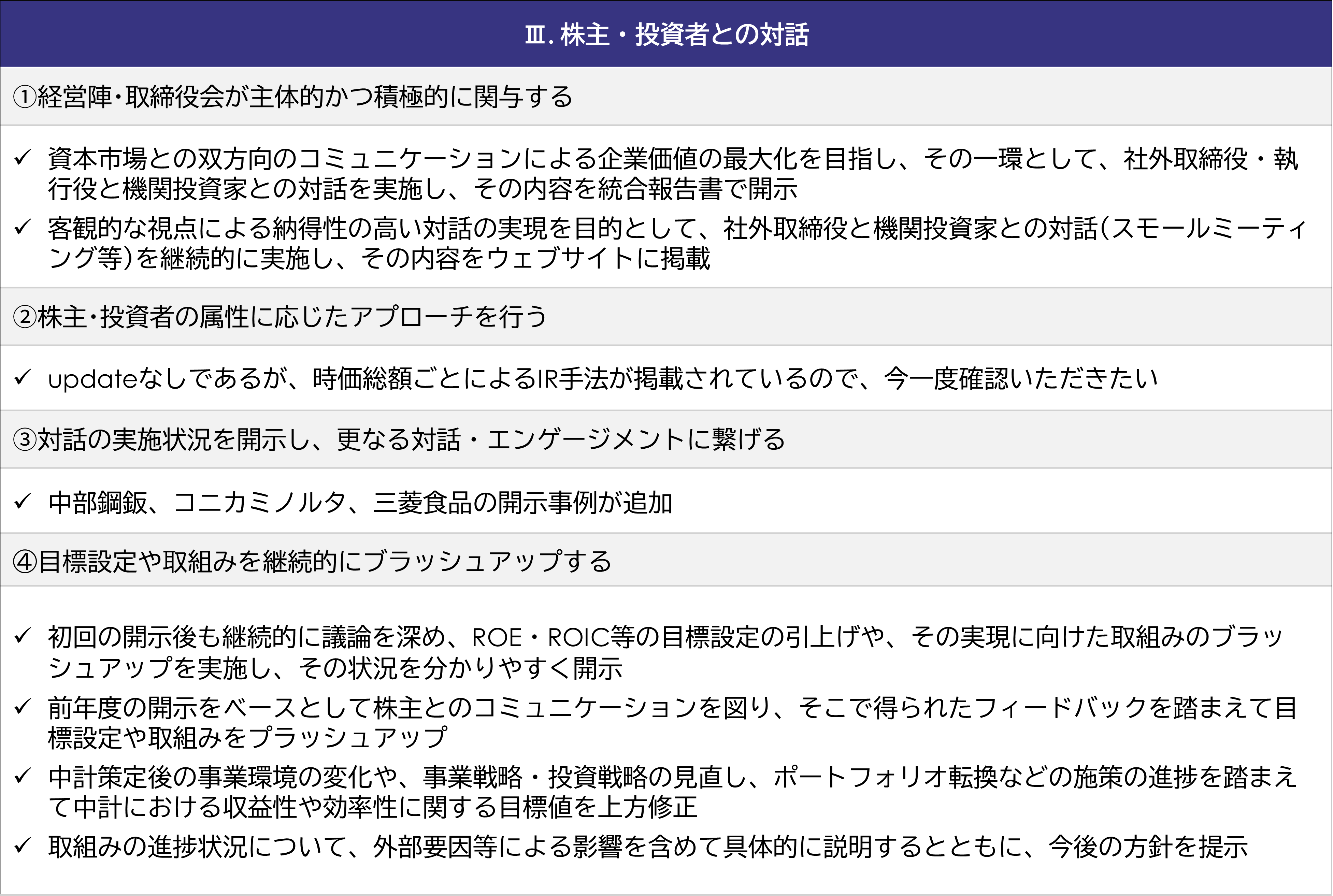 当社は2025年5月14日に資本コスト開示に関してupdateを行いました。参考になる点として「株主・投資者との対話」の状況について詳細に記載されている点です。IRの実施回数のみならず対応者や対話のテーマなど多岐に渡る内容が記載されております。当社では社外取締役も投資者との対話を行っている事、更には、投資者との対話内容が経営戦略の策定や開示情報の充実等にも反映されており「Ⅲ株主・投資者との対話」における投資者とのコミュニケーションを重要視している姿勢を感じ取る事が出来る内容となっております。