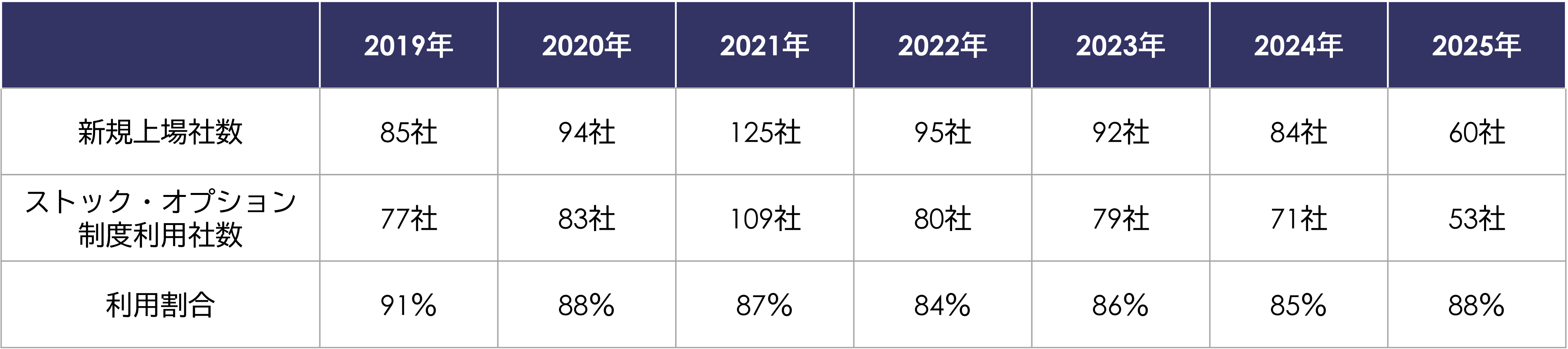 2025年も多くの成長企業がIPOを実現しましたが、新規上場社数は前年の84社から減少しました。これは、上場審査基準の厳格化など、IPOを取り巻く環境がより質を重視する方向へシフトしていることを示唆しています。こうした環境下で、資本政策の重要な要素であるストック・オプションの実態はどのように変化したのでしょうか。
